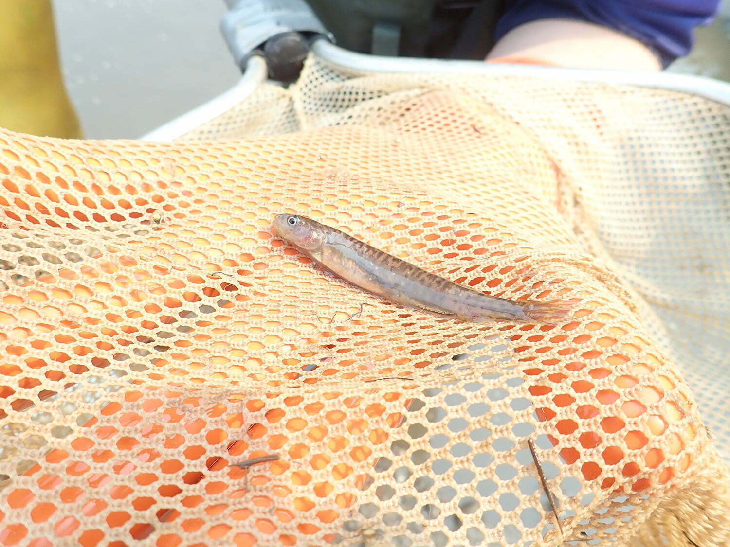 A second trip a week later to rescue another galaxid species, the Short-tailed Galaxias (Galaxias brevissimus) was not as successful. This fish is smaller than the Stocky Galaxias, at about 7cm in length, with a short tail and it’s body covered in a pattern of small to moderately large brown to almost black profuse blotches and spots, some coalescing to form larger patches. There are just two populations left of this fish, separated by a stretch of trout-infested river. One of these populations on the Bumberry Creek has been burnt, and the fires were too active for Mark to get in to rescue any of the fish. The second population at Jiboloro Creek yielded 30 fish, but the creek itself was already badly affected by drought, with water temperatures up to 29 degrees celsius, and the water quality extremely poor due to stock manure being washed into the remaining muddy pools.